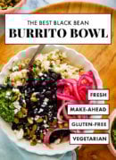 This homemade black bean burrito bowl recipe features cilantro-lime rice, tender black beans, pickled onions and fresh cilantro pesto! This healthy bowl makes great leftovers, too. It’s vegetarian (easily vegan) and gluten free. Recipe yields 4 hearty burrito bowls.