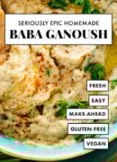 Basic baba ganoush is always vegan, gluten free and nut free. That makes baba ganoush a great party appetizer for guests who are following special diets—as long as your accompaniments fit the bill.