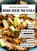 Bircher muesli is a healthy make-ahead breakfast that tastes like a treat. It’s basically overnight oats with fresh apple and applesauce, oats, raisins, nuts, and nut butter. Or, think of it as a special muesli with a wonderful apple flavor.