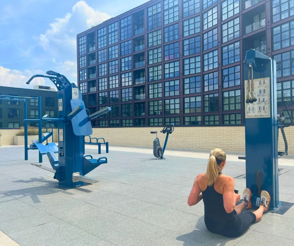 Pictured: Outdoor-Fit’s equipment on the open-air terrace of The Piazza Terminal, offering stunning city views and built to withstand Philadelphia’s high winds and all four seasons.