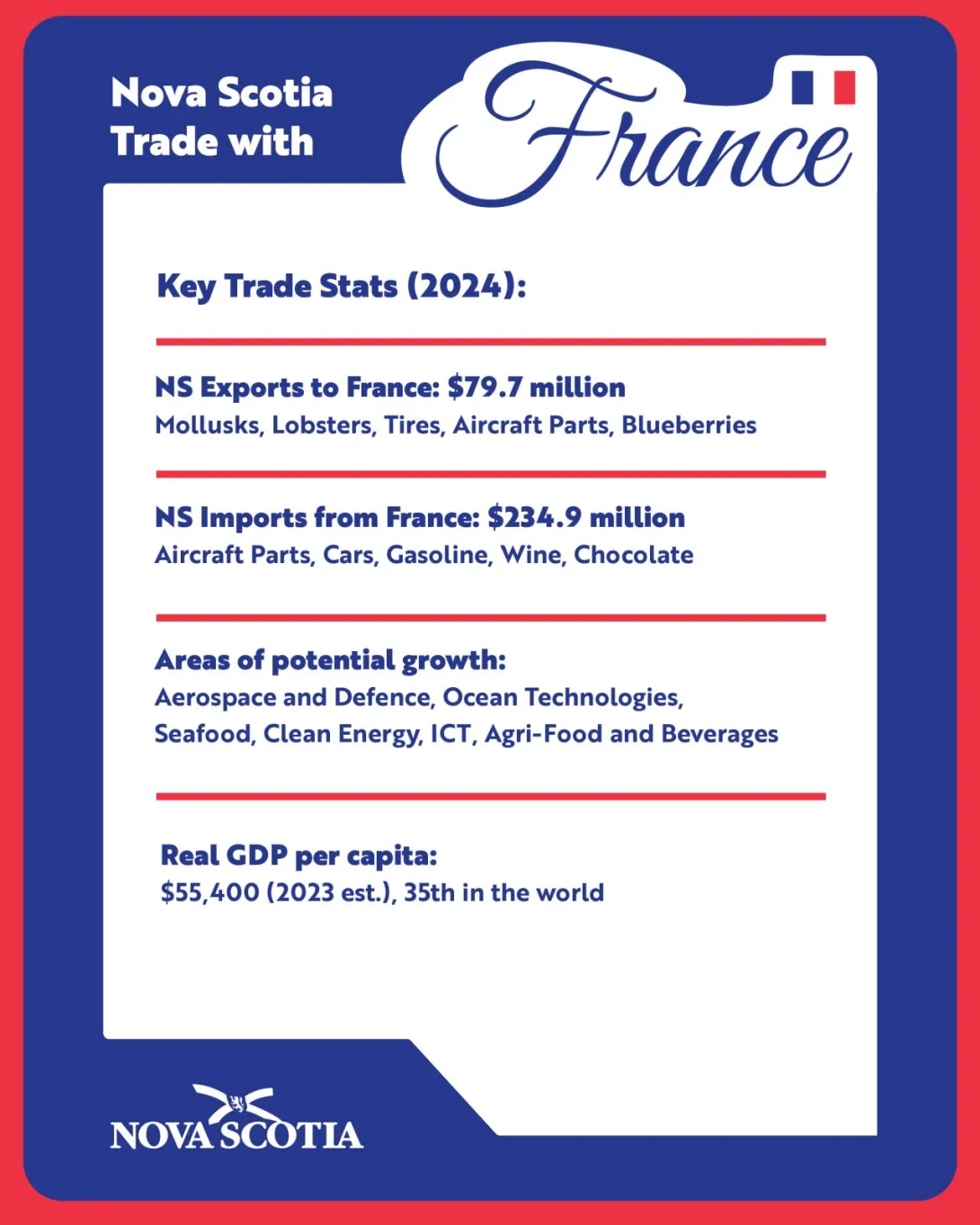 France is the world’s 7th largest economy and one of our top trading partners in Europe. In 2024 alone, Nova Scotia exported over $79 million worth of goods to France from lobster and mollusks to tires and aircraft parts. We also imported more than $230 million in products like motor cars, wine, chocolate, and aircraft parts.